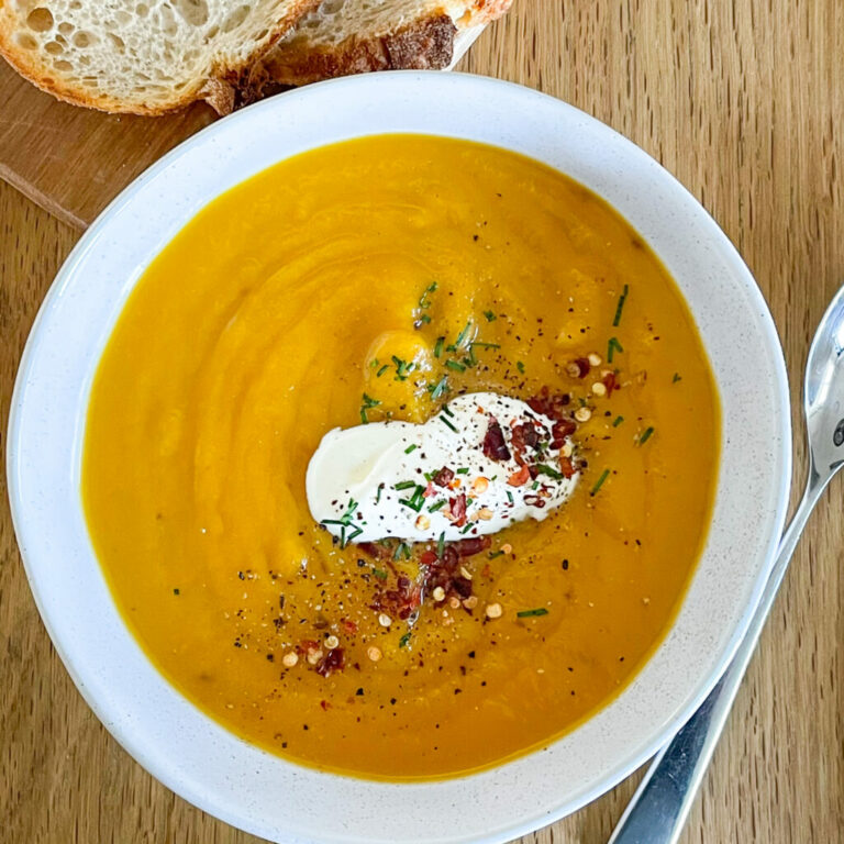 Warming and comforting pumpkin soup made better with a deep, roasted flavour. I love there is limited chopping and preparation required, the oven does all the work!